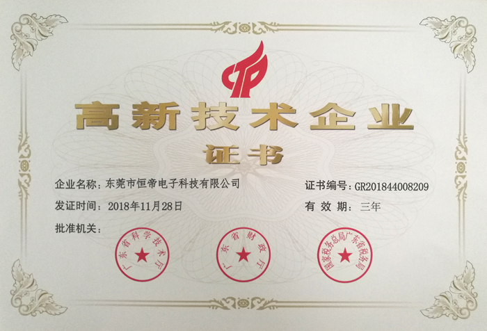 近日,經(jīng)國(guó)家科技部、財(cái)政部、國(guó)家稅務(wù)總局專家評(píng)審,東莞市恒帝電子科技有限公司獲得了由廣東省科技廳、財(cái)政廳、省國(guó)稅局、省地稅局聯(lián)合頒發(fā)的《高新技術(shù)企業(yè)》證書,這標(biāo)志著我司成為國(guó)家高新技術(shù)企業(yè)的一員。